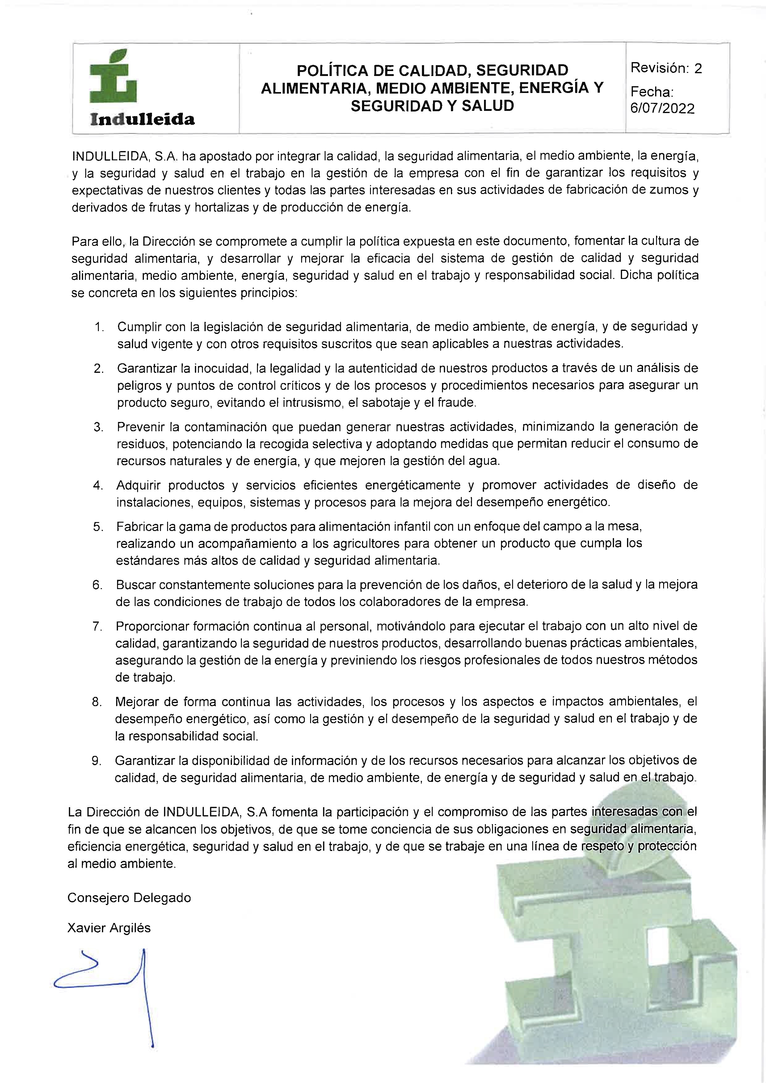 Política de Calidad, Seguridad Alimentaria, Medio Ambiente, energía y seguridad y salud