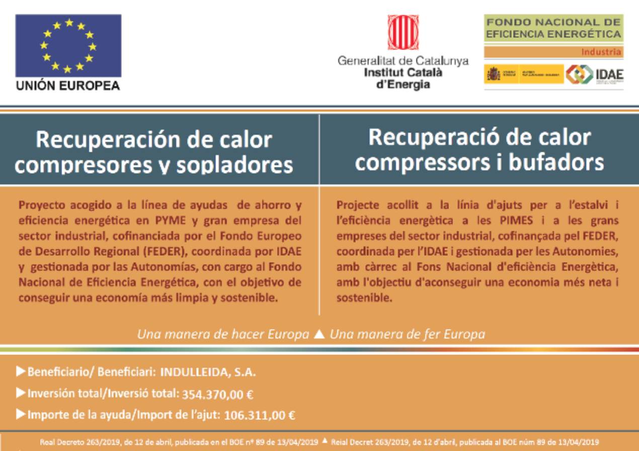 Este proyecto ha sido subvencionado por el “Programa de ayudas para actuaciones de eficiencia energética en PYMES y grandes empresas del sector industria”, cofinanciado por el Fondo Europeo de Desarrollo Regional (FEDER) y gestionado por el Instituto Catalán de Energía (ICAEN), con cargo al Fondo Nacional de Eficiencia Energética.